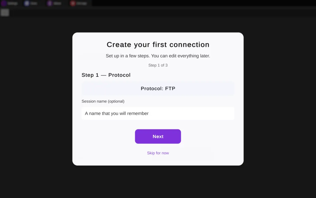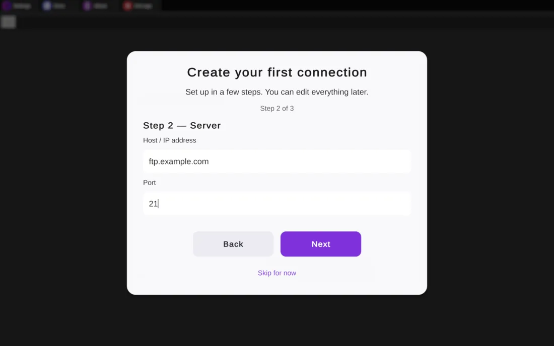 On first launch, FQB-Transfer can guide you through a quick 3-step connection setup. You can edit everything later, so don’t overthink it.