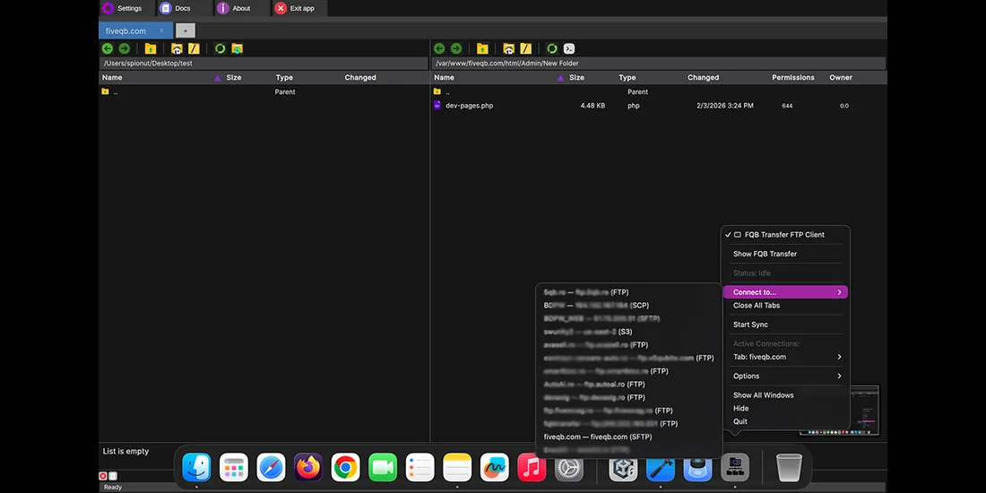 This guide shows how to connect to FTP, SFTP, FTPS, S3 and WebDAV on macOS using FQB Transfer, a WinSCP-style FTP client for Mac. If you’ve used WinSCP on Windows, the workflow will feel familiar: create a saved session, connect, and transfer files using drag & drop. The tutorial below explains each step clearly, from choosing the right protocol to connecting with a single click.