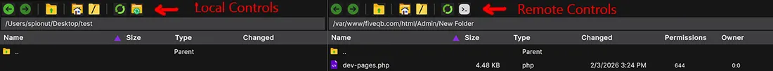 The local panel shows files and folders on your Mac. Toolbar buttons here control navigation and actions on your local filesystem.